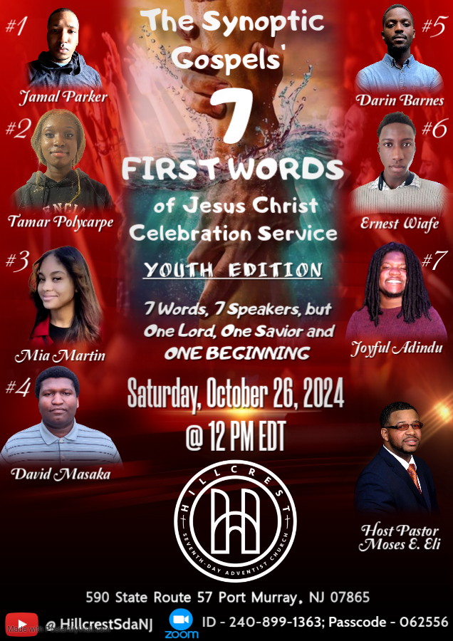 At 12:00 PM we move to the sanctuary for our worship service, which lasts around 2 hour. This Sabbath, we will be having our youth doing the Seven First Words of Jesus, each giving mini sermon/ spoken word!! Our song service can vary between contemporary and hymns, which we follow with a message from our pastor. Once we close, we enjoy taking time to visit and getting to know our guests. If you stay seated as everyone leaves, one of our leaders will come meet you. We would love to get to know you more. (In-person, Zoom, and online)